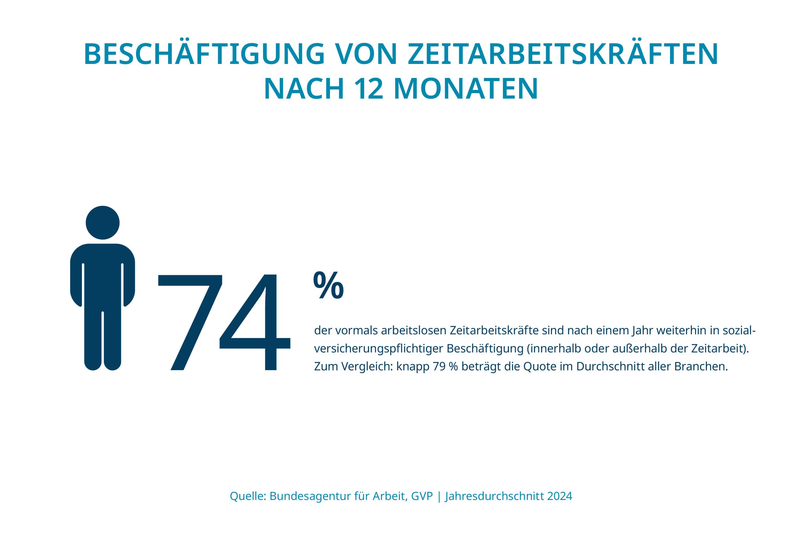 BA-Daten zeigen, dass drei von vier Personen, die ihre Arbeitslosigkeit durch eine Beschäftigungsaufnahme in der Zeitarbeit beendeten, nach 12 Monaten immer noch sozialversicherungspflichtig beschäftigt sind, davon ein Drittel in anderen Branchen. Damit müssen sich die Personaldienstleister nicht hinter anderen Wirtschaftszweigen verstecken, denn in der Gesamtwirtschaft liegt diese Quote mit knapp 79 Prozent nur unwesentlich höher. Im Hinblick darauf, dass unter den Zeitarbeitskräften im Vergleich zu Beschäftigten insgesamt viele Helfertätigkeiten ausüben und über wenig Berufserfahrung verfügen, verdeutlicht das die Leistung der Branche umso mehr.