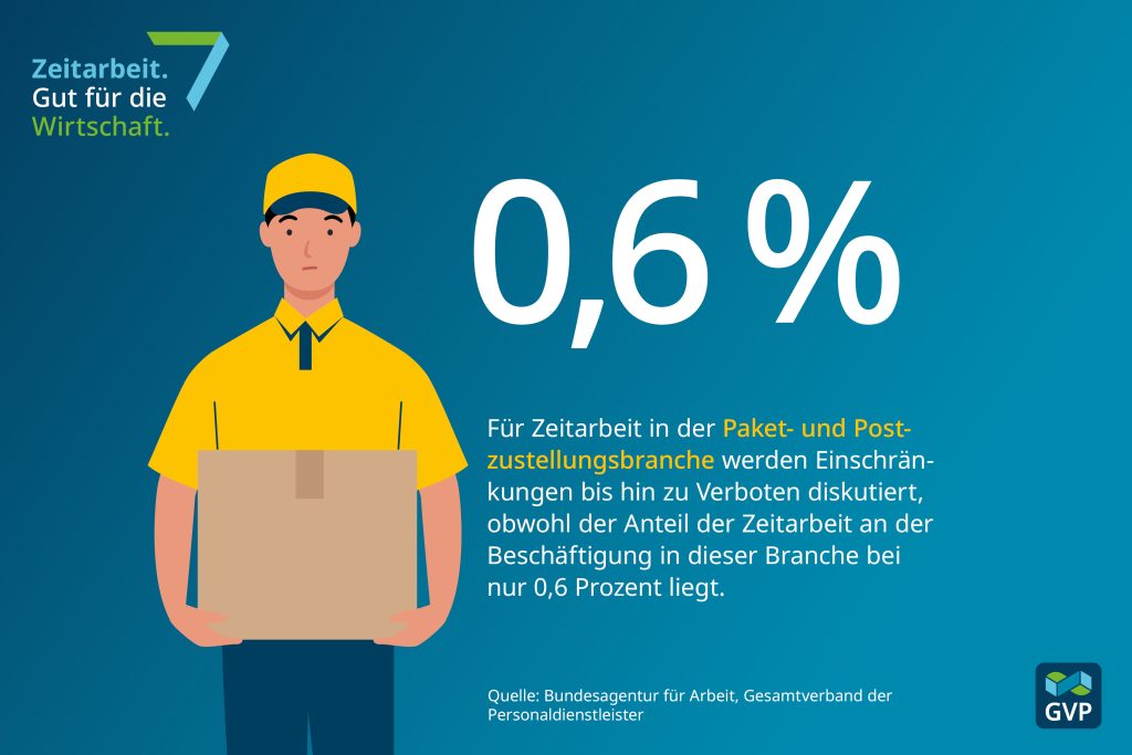 Hintergrund: Für Zeitarbeit in der Paket- und Postzustellungsbranche werden Einschränkungen bis hin zu Verboten diskutiert, obwohl der Anteil der Zeitarbeit in der Branche mit knapp 0,8 Prozent sehr gering ist. Solche Vorhaben bewirken keine Verbesserungen bei den Arbeitsbedingungen oder beim Fach- und Arbeitskräftemangel, sondern können die Situation sogar verschärfen.