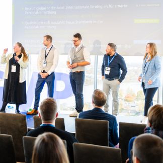 Die nachmittägliche Barcamp-Session in Kleingruppen ermöglichte zum Abschluss des ersten Tages einen besonders intensiven Austausch von Meinungen und Ansichten. So konnten sich die Teilnehmerinnen und Teilnehmer mit den wesentlichen Inhalten der neuen Qualitätsstandards guter Personalvermittlung vertraut machen und erörterten gemeinsam Wege, wie diese optimal mit Leben gefüllt werden könnten. Aber auch die Themen der Disruption durch KI, Do’s und Don’ts im Profilvertrieb, Einsatz von KI im Recruiting-Alltag sowie der Gedanke des Networkings innerhalb der Branche „"Miteinander statt Gegeneinander" boten wichtige Erkenntnisgewinne für alle Beteiligten in der täglichen Arbeitspraxis.