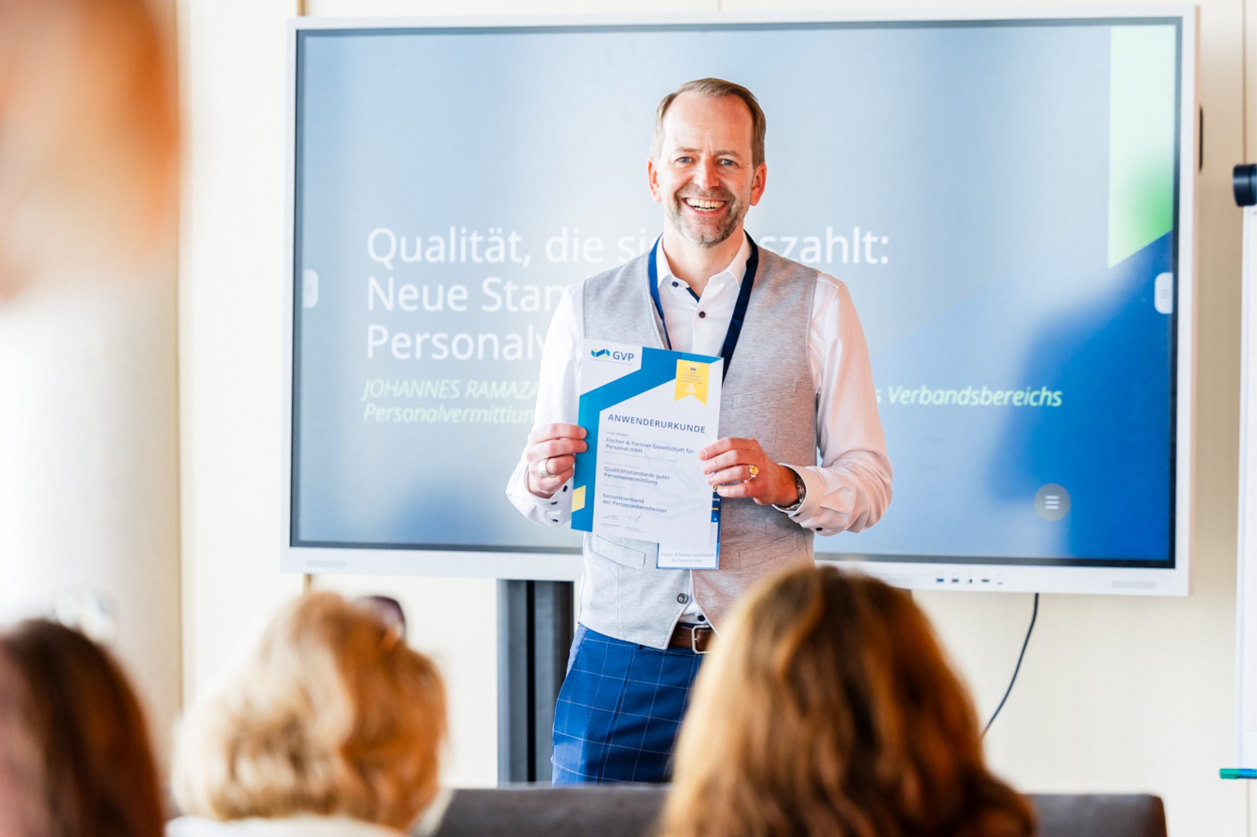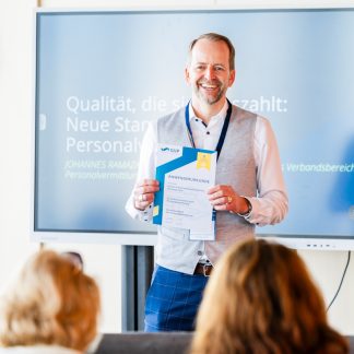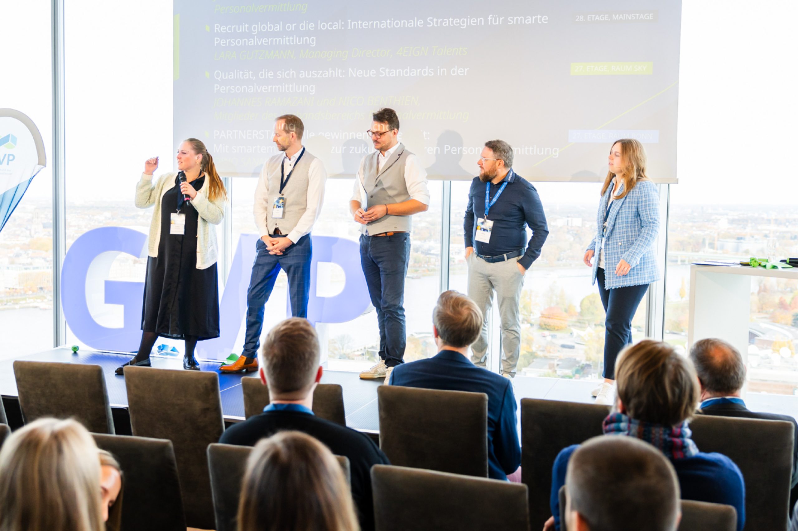 In einem Panel der nachfolgenden Praxis-Session erläuterte Nico Benthien, Mitglied des GVP-Verbandsbereichs Personalvermittlung, die neuen GVP-Qualitätsstandards guter Personalvermittlung. Diese seien für die Anwender ein absoluter Gamechanger, denn „wer Qualität lebt, vermittelt keine Jobs, sondern Perspektiven.” Benthien zeigte dabei eindrucksvoll auf, wie Unternehmen mit Hilfe der Qualitätsstandards durch klare Qualität und hohe Standards langfristig erfolgreich agieren könnten.